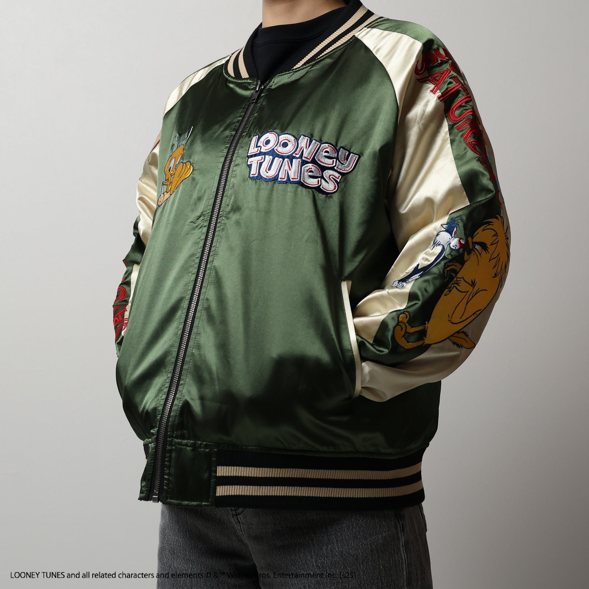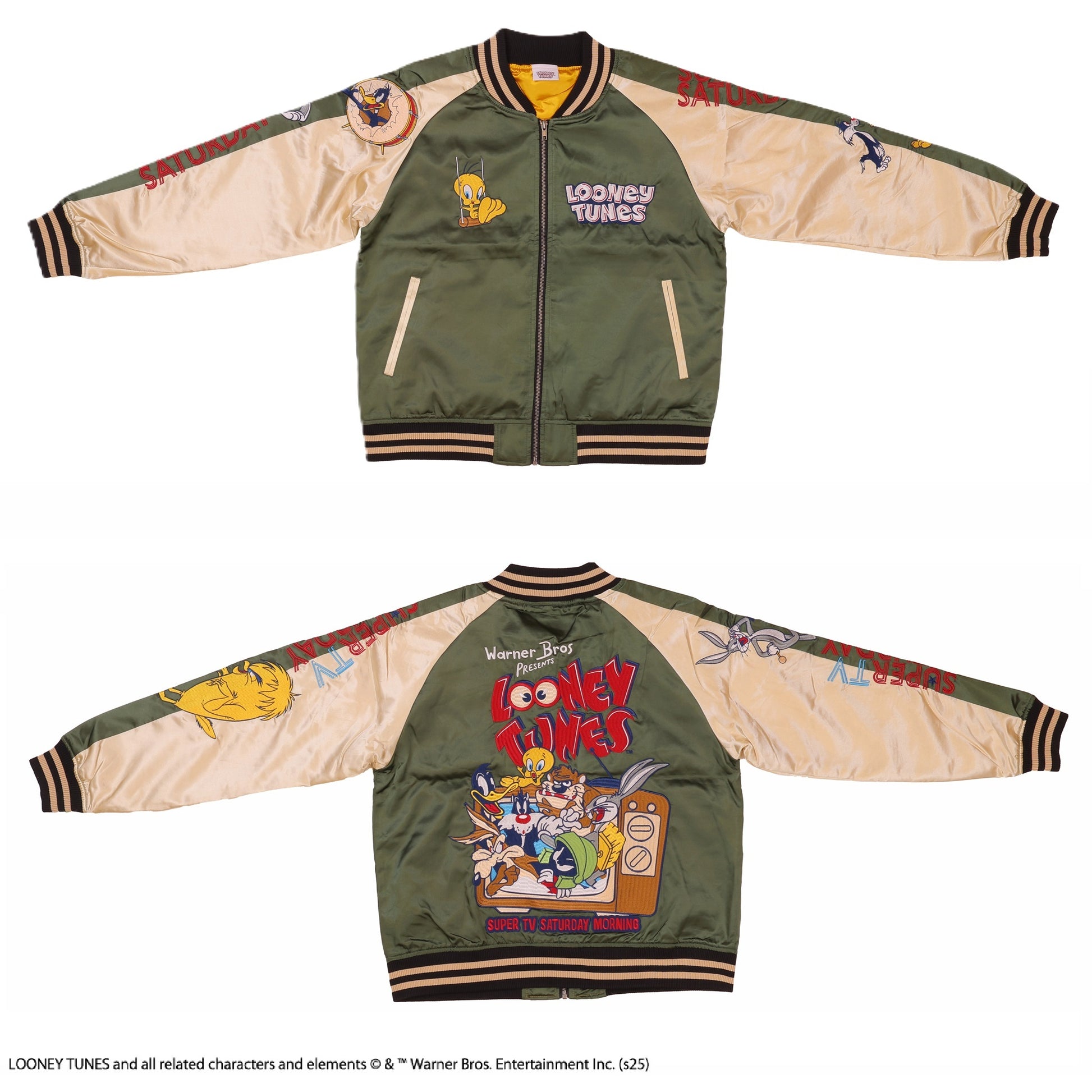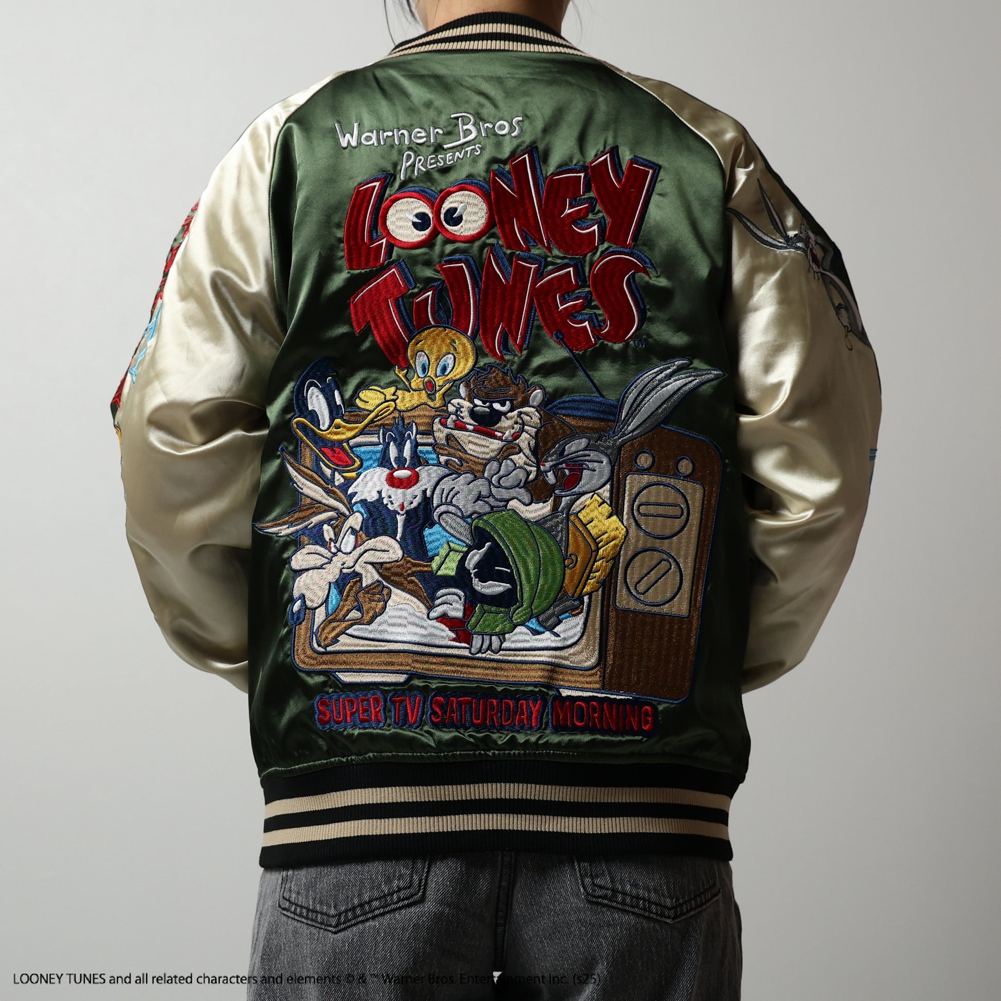 The Looney Tunes TV Saturday Sukajan is a unique piece designed with nostalgic characters. The vibrant colors and detailed embroidery add a playful touch to your fashion.