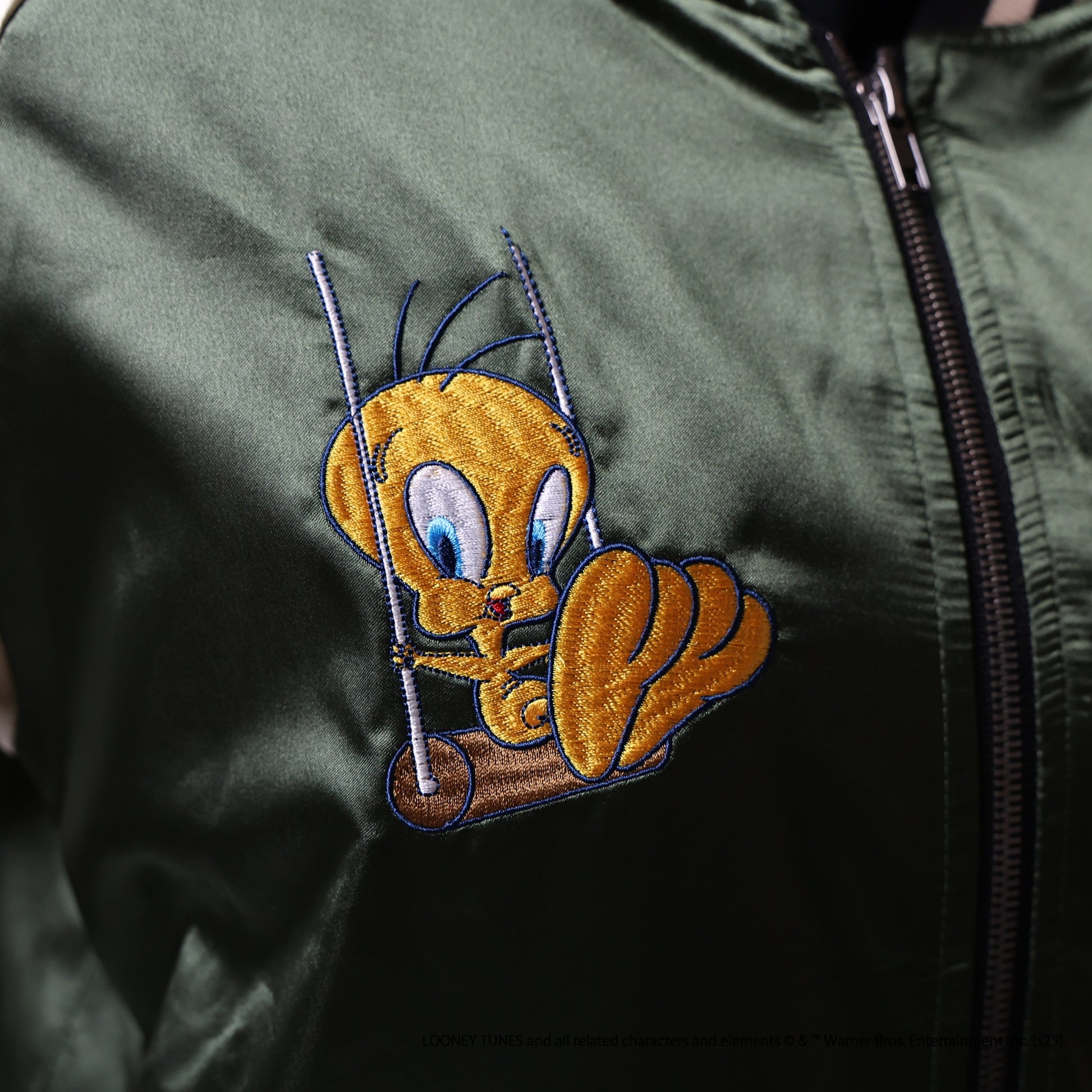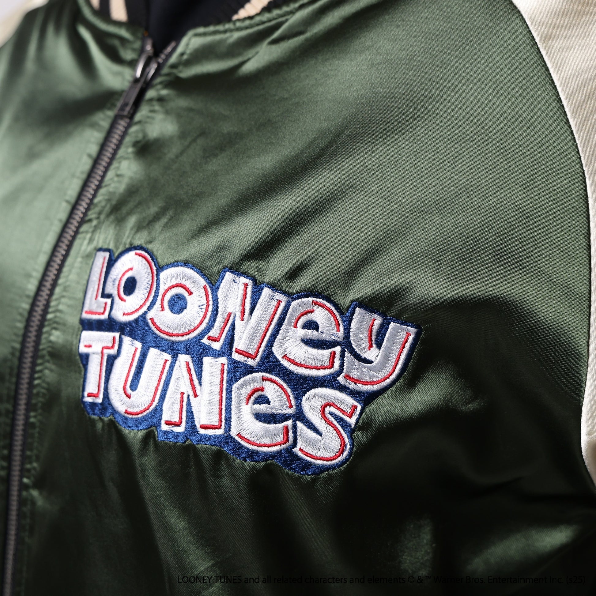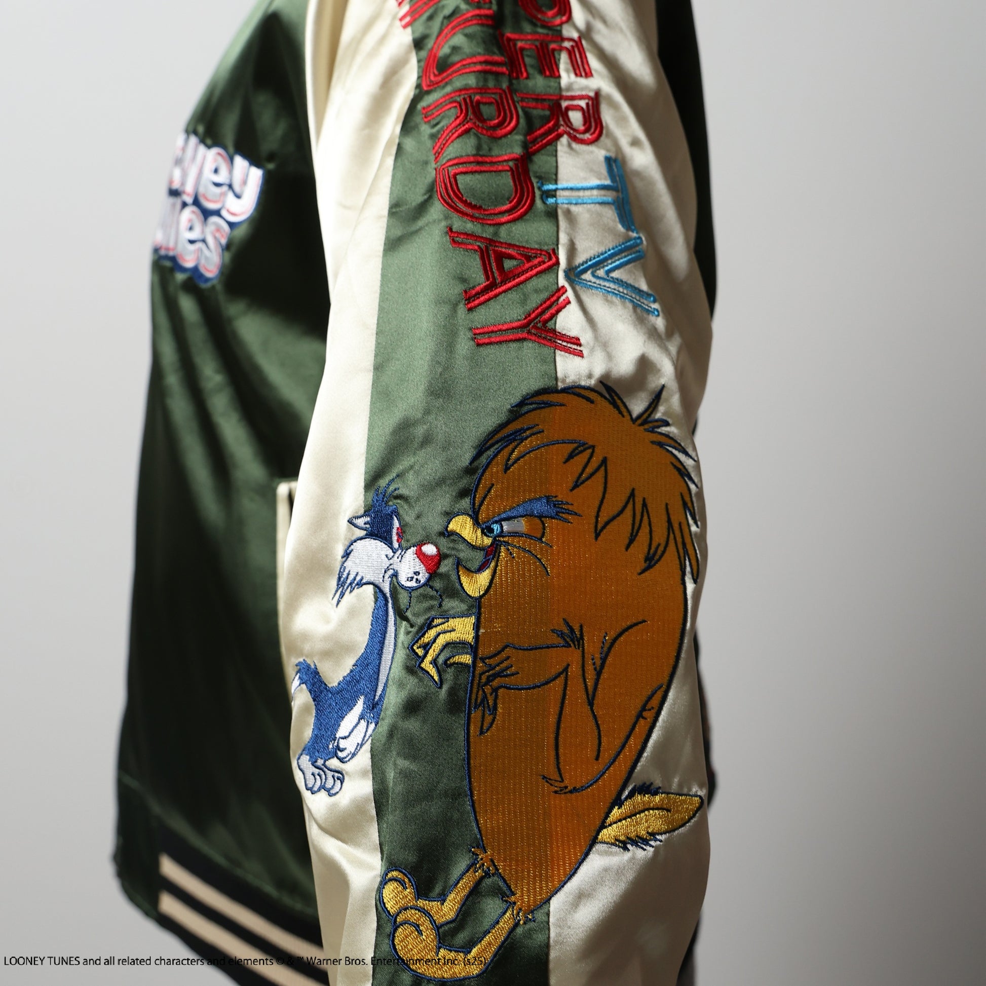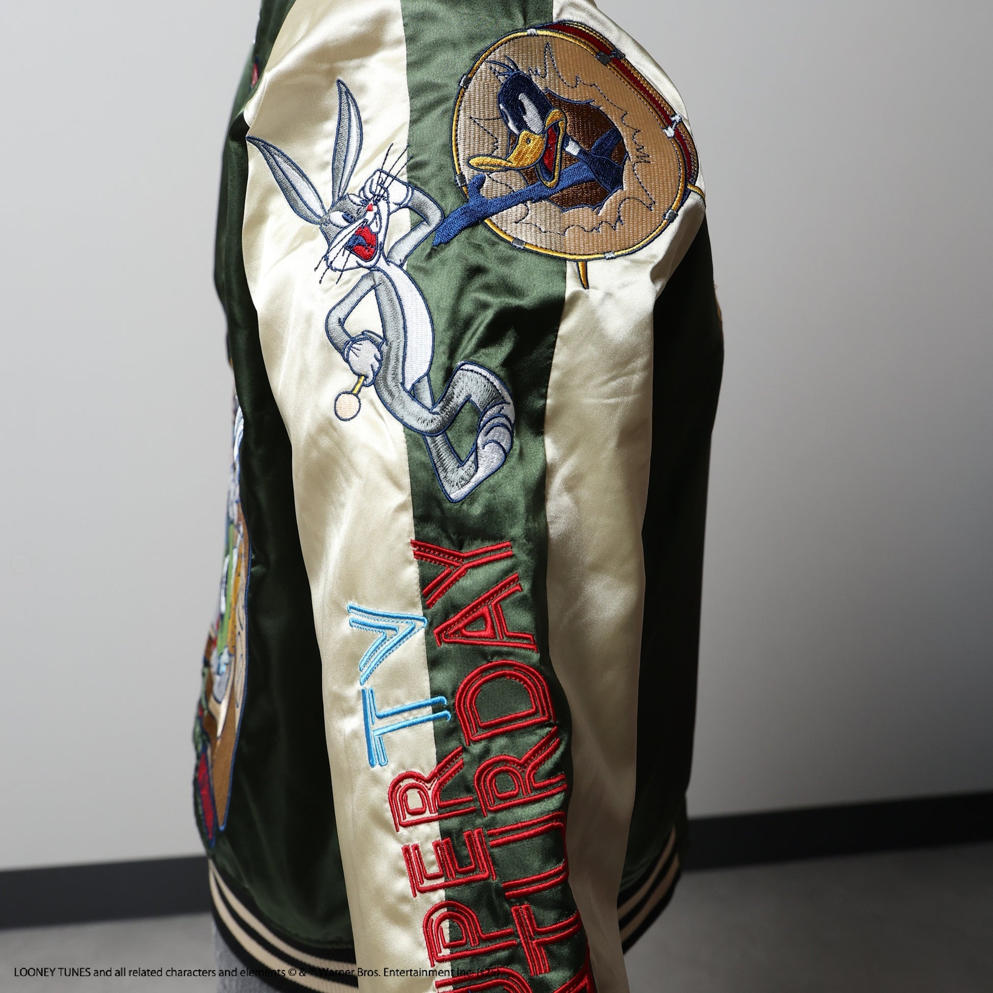 The Looney Tunes TV Saturday Sukajan is a unique piece designed with nostalgic characters. The vibrant colors and detailed embroidery add a playful touch to your fashion.